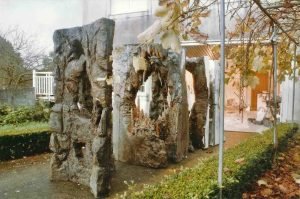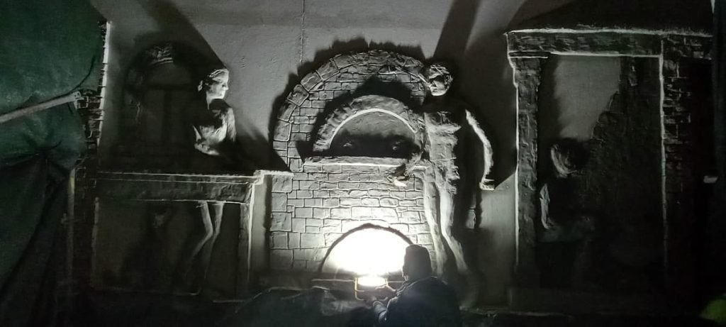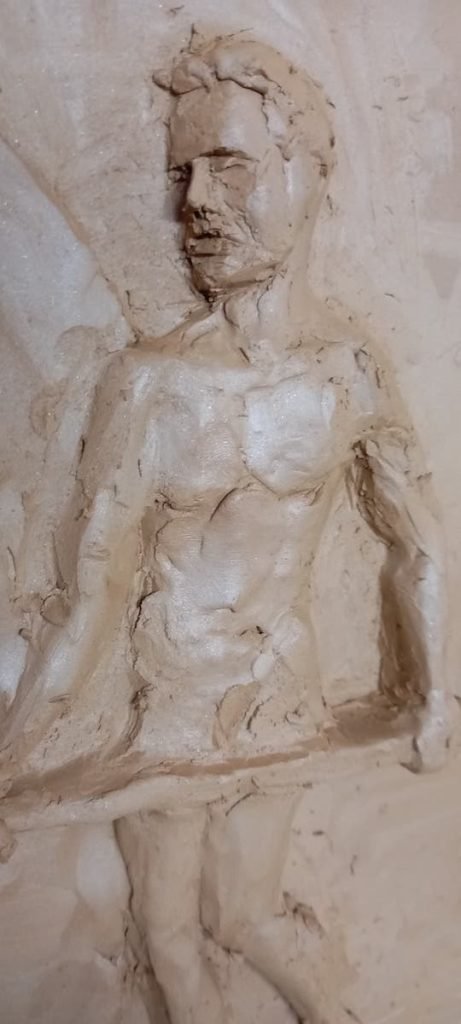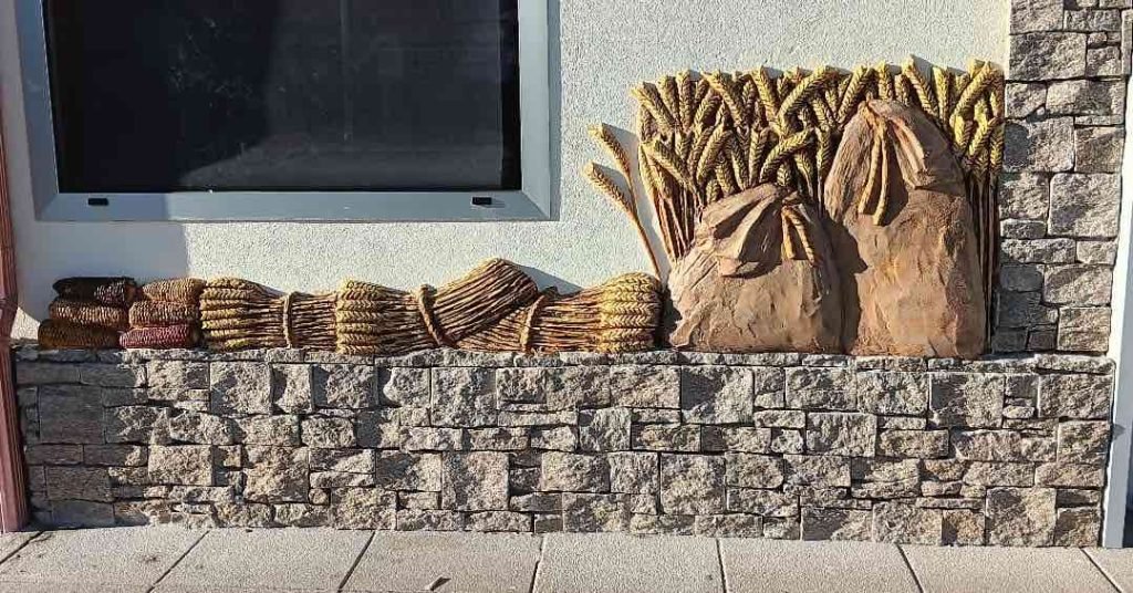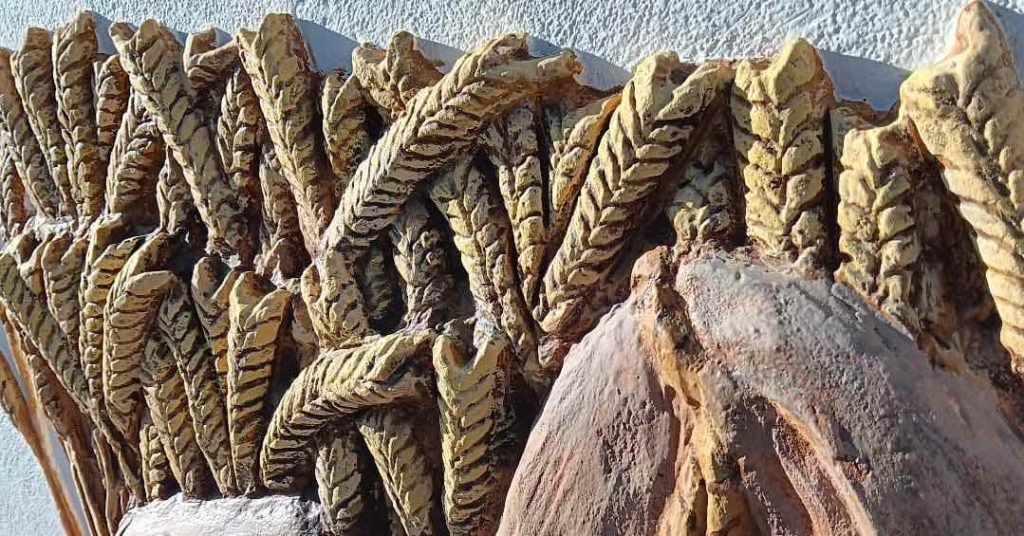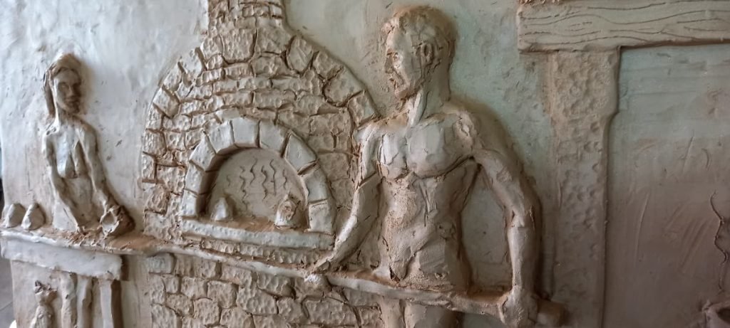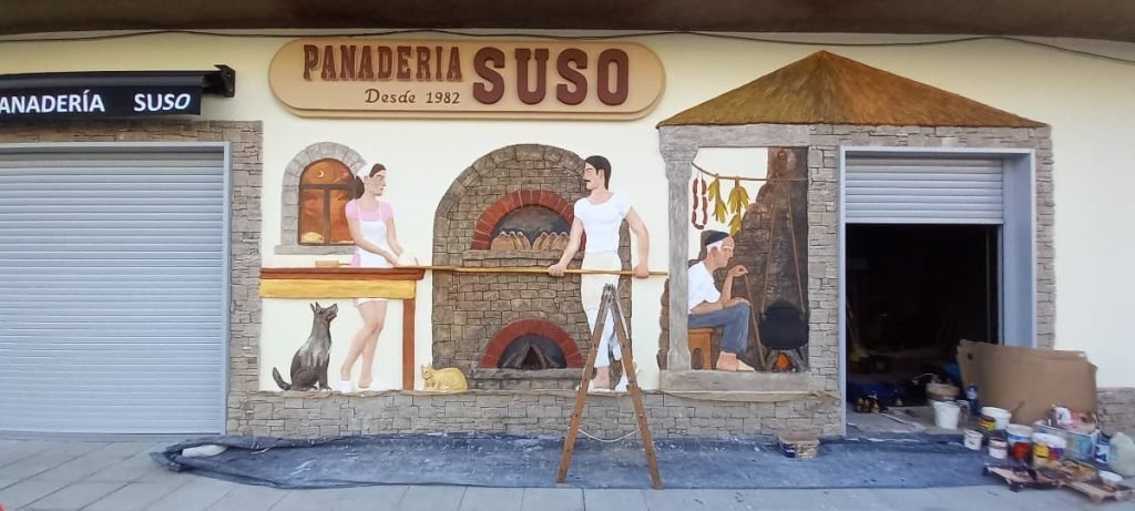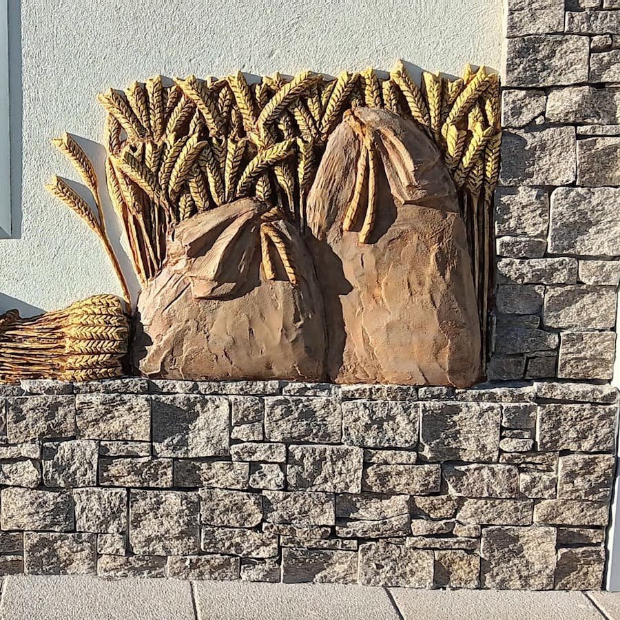 Mural altorelieve con mortero modelado, tallado y pintado para la sede central de Panadería Suso.