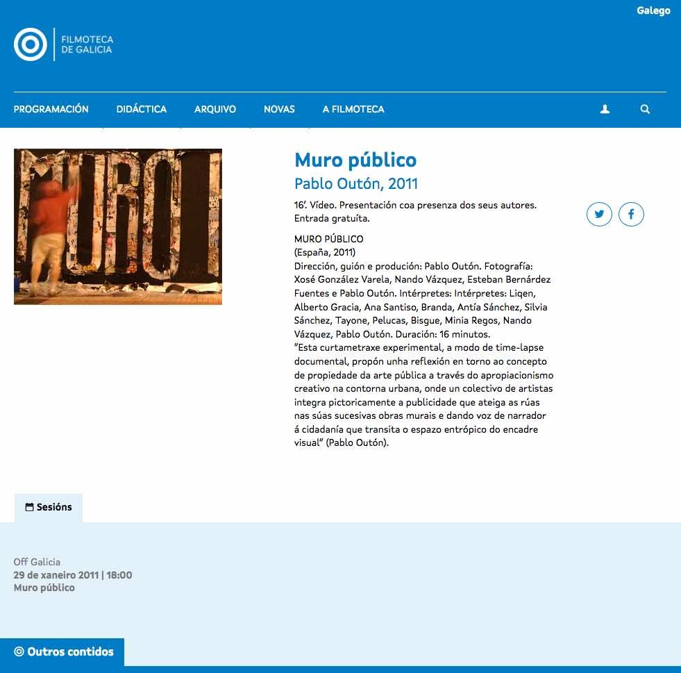 O CGAI (Centro Galego de Artes da Imaxe), proxectará a curtametraxe ‘Muro Público’ (2011, 16 min.) dentro da súa sección Off Galicia.