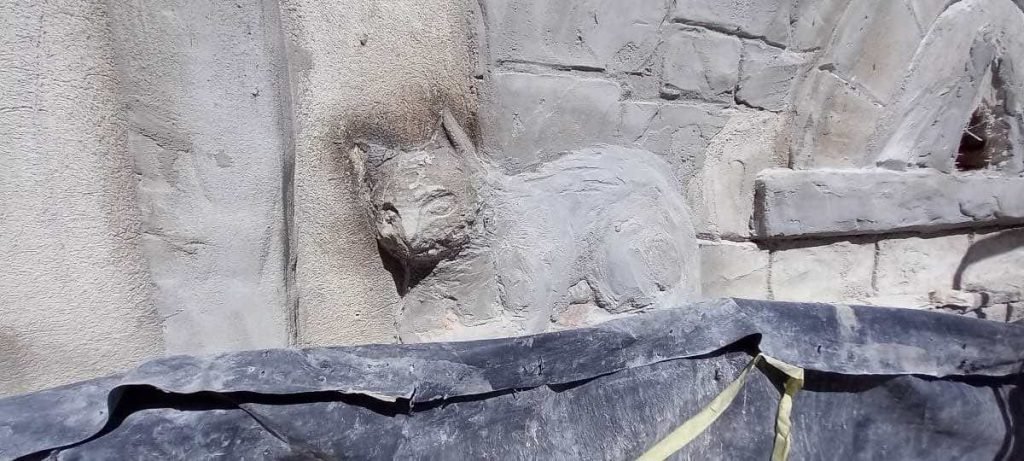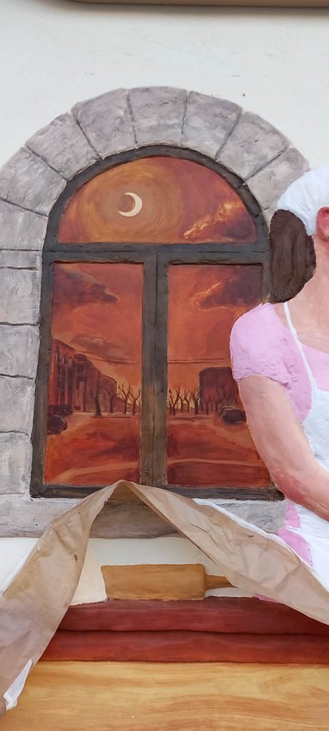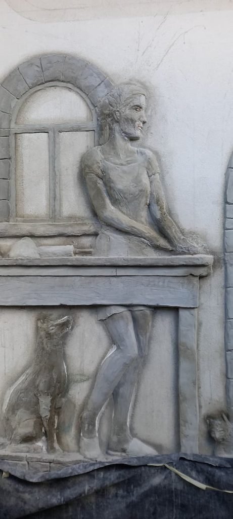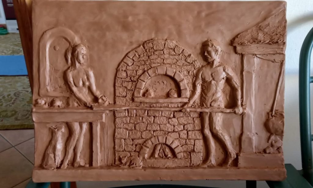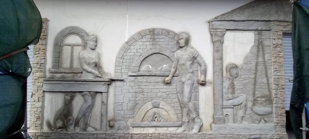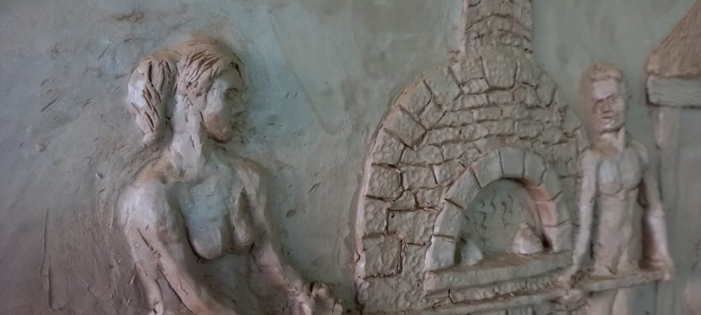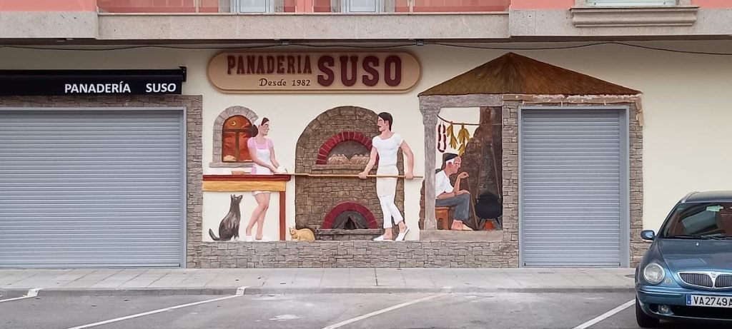 Mural altorelieve con mortero modelado, tallado y pintado para la sede central de Panadería Suso.