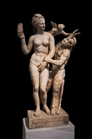 Como ejemplo más característico sería el «grupo de Afrodita y Pan», de Delos, en el helenismo tardío, del Museo Nacional de Atenas, ella está defendiéndose de su hijo con la zapatilla, un symplegma sin excelsa narratividad, de corte humorístico y perspectiva bidimensional de grupo unilateral, para ver de frente (como el célebre Laoconte). La figura de la diosa ha sufrido el proceso de vulgarización de los temas mitológicos del último helenismo y su representación acabará por desaparecer entrada la época romana.