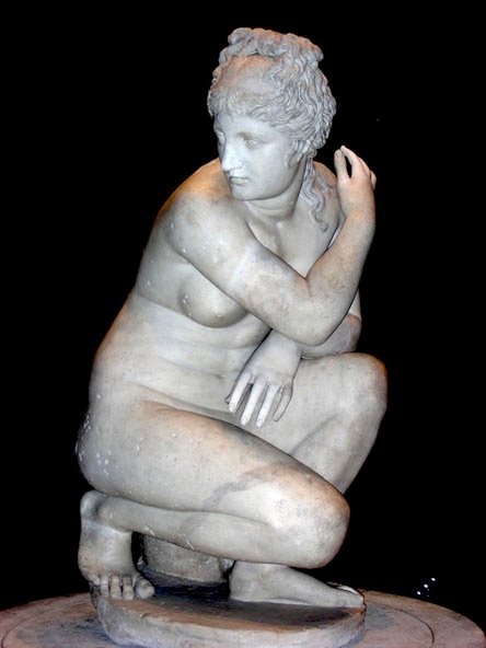 La más importante a nivel iconográfico es el tipo “Afrodita en cuclillas o arrodillada”, de finales del S.III o comienzos del S.II a.C., identificada por Plinio con la «Venerem lavantem sese» hacia el 250, una atribución dudosa a Doidalsas de Britinia (RobAG), que nos ha llegado en muchas copias destacando la del Museo de las Termas y la Venus de Vienne (Louvre). Al parecer este motivo ya había sido desarrollado en el s.IV, tal vez por Skopas, y un ánfora del pintor de Kamiros así lo muestra. Estamos por primera vez ante una composición piramidal de la diosa con una visión multiperspectivista, en la cual semeja estar escurriéndose el agua del cabello, con la parte superior del cuerpo en ángulo recto con las piernas. Ahora sus volúmenes alcanzan formas más opulentas, tal vez por influencia asiática, y se practica un excesivo gusto por la superficialidad y la apariencia exterior. Este abandono helenístico de la sobriedad por lo anecdótico, del esquema por el detalle, del carácter por la expresió , deriva paulatina y tardíamente en la búsqueda de un entretenimiento del espectador y de la simple diversión.