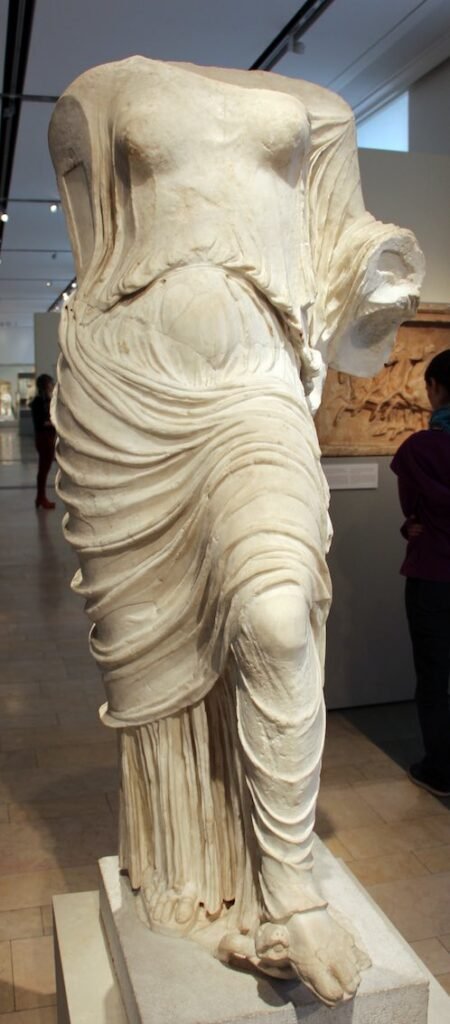 Su importancia radica en la novedad de que presenta todo su torso completamente desnudo. También influyente es el hecho de dar solución a la relación que establece la escultura con la arquitectónica, formando una base sólida desde los pies, cubriendo sus piernas con ropajes envueltos en la cintura que caen en una “columna” de pliegues y dejando libre el torso para que los brazos puedan moverse equilibradamente, prescindiendo de cualquier soporte adicional.