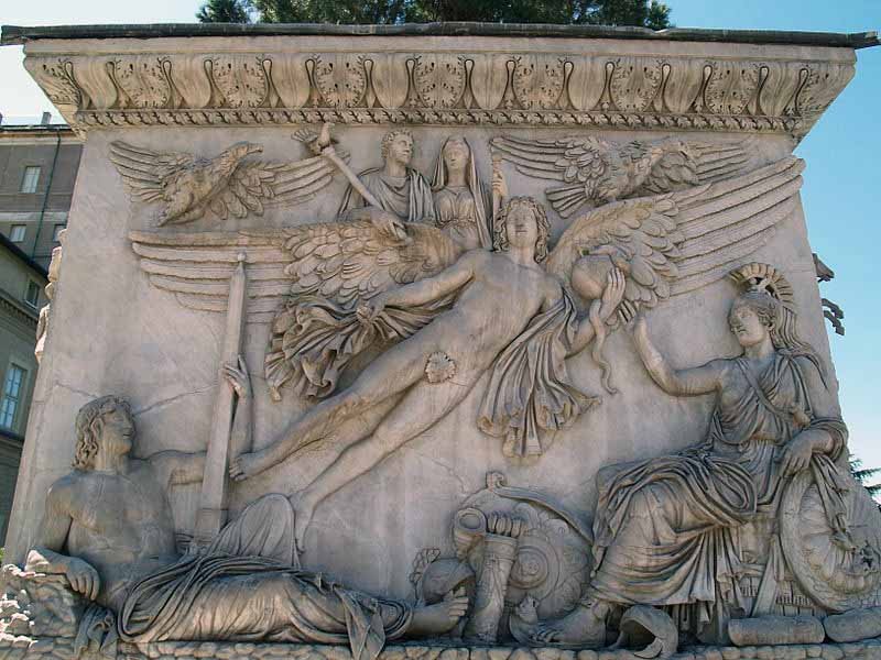 La iconografía romana de la ideología de la victoria es representada por los estandártes y las águilas que portaban las legiones. En época augústea las ramas de laurel de la Victoria, árbol de Apolo, dieron lugar a coronas simples que otorgaban divinidad. También tuvo importancia la corona cívica de encina, asociada a Júpiter, y la palma de la victoria que otorgaba. Más tarde se tipificó al águila de Júpiter, con alas abiertas agarrando la corona cívica, usada al principio en monedas de Asia Menor. Éste es exactamente el símbolo que reintrodujo el III Reich, con el agregado de la esvástica levógira central. Un claro ejemplo romano es la pareja de águilas que domina la escena de la apoteosis de Antonino y Faustina, de la Basa de Antonino en la que el Genio del Campo Marzio abraza una miniatura del obelisco del Reloj de Augusto que se alzaba allí.